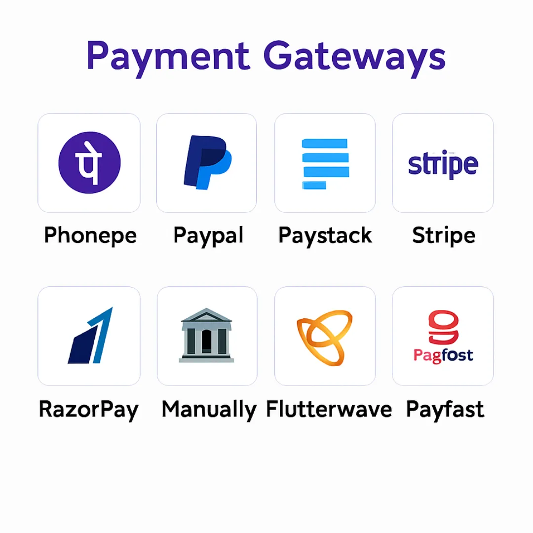 Receive payments globally and securely. We support Razorpay, PhonePe, Stripe, PayPal, Payfast, Flutterwave, and manual payment options for everyone.